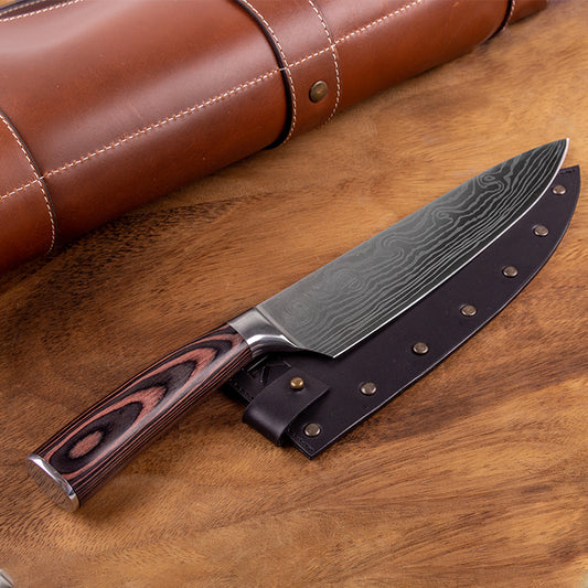 Nuestra colección presenta una variedad de cuchillos de cocina fabricados con diferentes tipos de acero, cada uno adaptado a distintas necesidades culinarias. Ofrecemos una gama de estilos para cada ocasión en la cocina. Todos nuestros cuchillos incluyen una funda protectora de piel personalizable, garantizando tanto funcionalidad como estilo en tu conjunto de herramientas culinarias.