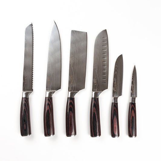 Set 6 Cuchillo KOEN for Chefs Acero Inox. Grabado (Chef 8'’, Pan 8'', Santoku 6.5'', Nakiri 6.5'', Santoku 4.5'', Mondador 4'')
