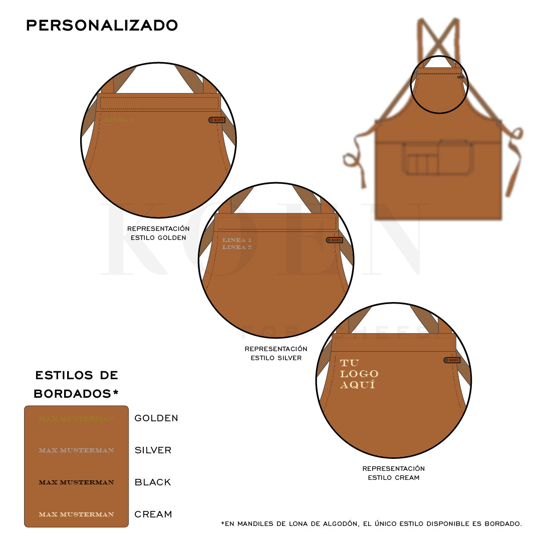 Mandil protector para barra fria o caliente, coctelería, piso o uso personal. Con correas ajustables y área personalizable en el pecho. Hecho a mano en México por artesanos expertos y procesos de alta calidad. |