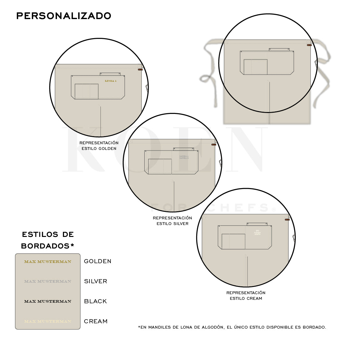 Mandil protector para servicio en piso o uso personal. La correas ajustables y área personalizable a altura de cadera. Hecho a mano en México por artesanos expertos y procesos de alta calidad. |