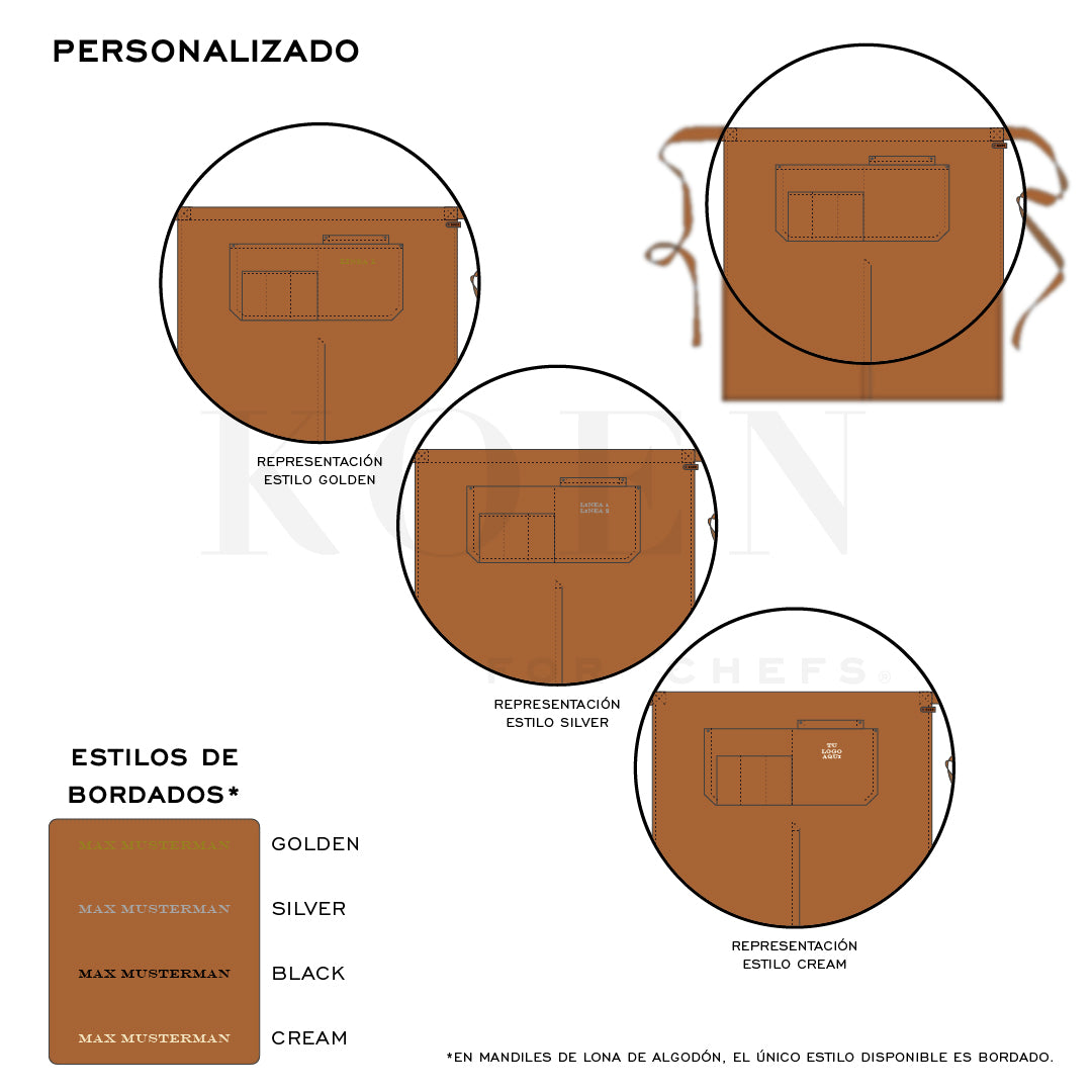 Mandil protector para servicio en piso o uso personal. La correas ajustables y área personalizable a altura de cadera. Hecho a mano en México por artesanos expertos y procesos de alta calidad. |